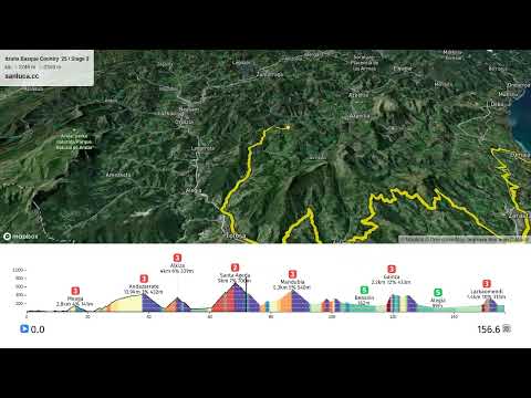 Gainza is a KOM cat. 3 climb, which starts at 117.5 km (39.1 km to go) and ends at 119.7 km (36.9 km to go). It has total distance of 2.2 km, and an average gradient of 12.1%, going from 168 to 433 meters of altitude.