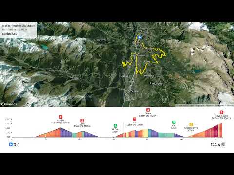 The total distance of the stage was 124.4 km. The stage included 5 categorized climb(s) and 2 intermediate sprint(s), and had a total elevation gain of 3970 m, and a total descent of -2393 m.