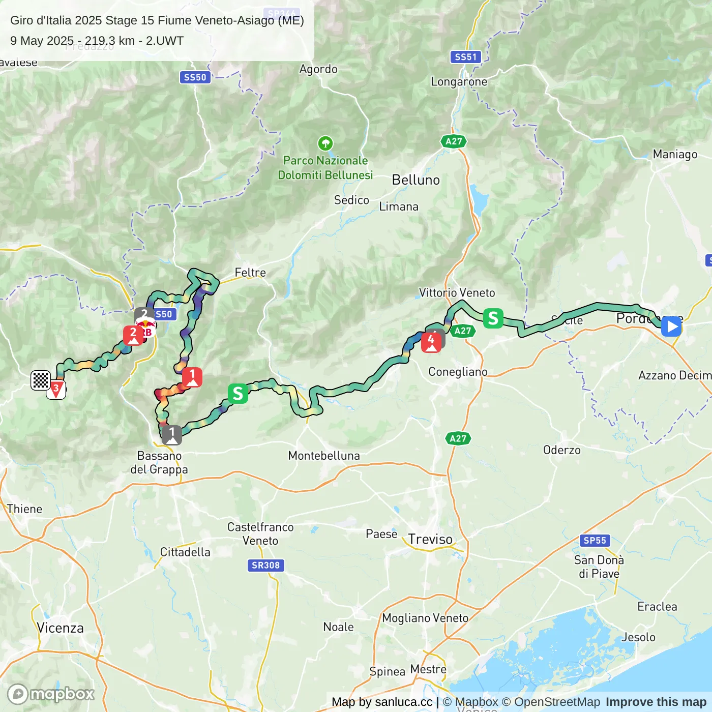 Possagno is a Sprint at 89.8 km (129.5 km to go).