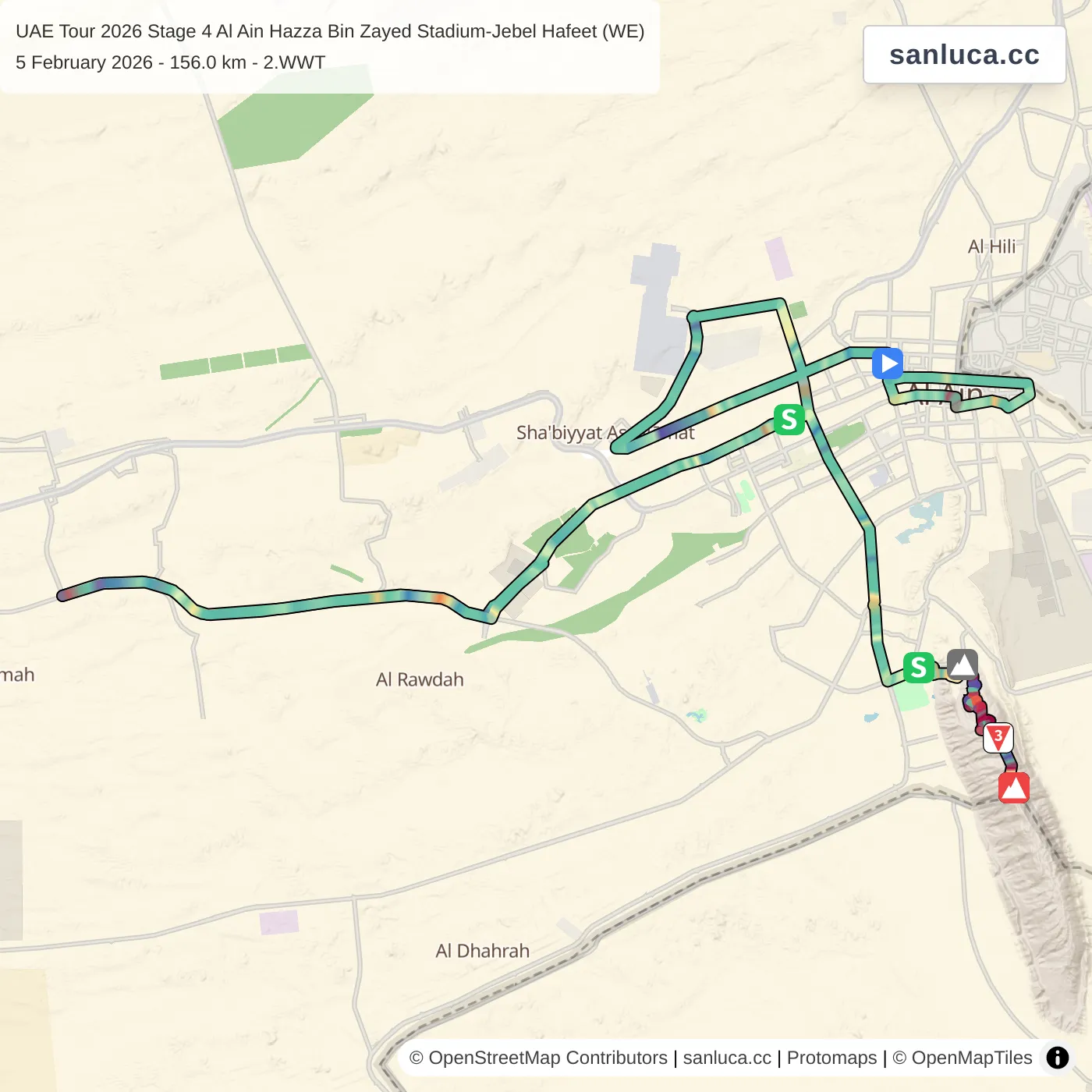 The stage starts in Al Ain Hazza Bin Zayed Stadium and finishes in Jebel Hafeet, starting at with an expected finish at (average speed of 39 km/h).